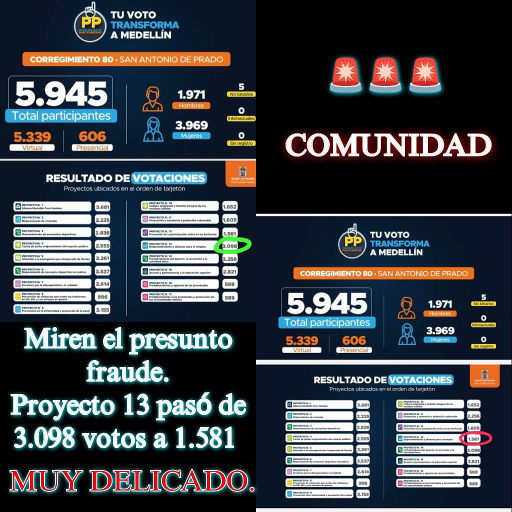 La comunidad denunció presuntas irregularidades en la publicación de los resultados de las votaciones del Presupuesto Participativo en el corregimiento San Antonio de Prado. El pasado 8 de septiembre de 2025, en el proyecto No. 13, correspondiente a la iniciativa de “Emprendimiento y Alianzas para el Empleo”, se reportó en horas de la mañana un total de 3.098 votos, mientras que en la tarde la cifra descendió drásticamente a 1.581 votos.